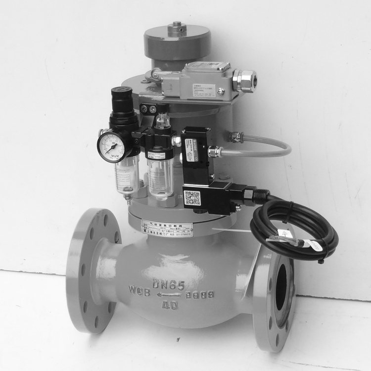 液氨氣動切斷閥是儲罐站用防火保護裝置,氣缸安置防高溫合金元件,在出現火情或環境異常高溫能夠自動泄壓排氣關閉的功能,主要應用在可燃有毒氣體/液體的場合。配套氣動三聯件(防爆電磁閥,空氣過濾減壓閥)及(行程開關)可遠程控制閥門的開關作業。同時可與現場氣體泄漏探測儀連接,在儲罐管道接口端或者閥門出現泄漏、裝卸過程出現泄漏,探頭探測到空氣中液氨/燃氣含量超標報警,主機切斷電源截斷氣源,電磁閥排空氣源壓力,切斷閥快速關閉。起防止罐內介質倒流的作用。