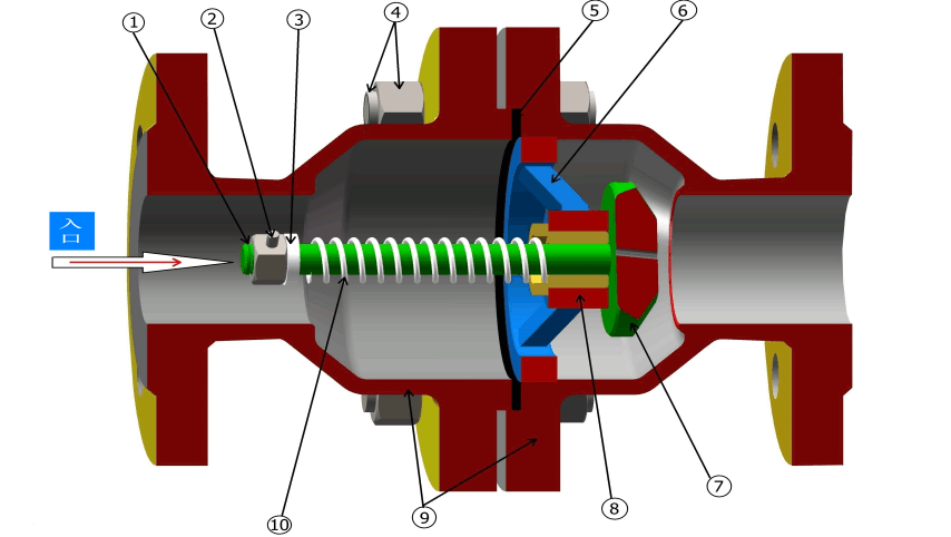 YG02-25限流閥 又名超流閥是使用于城市燃氣,液氨,液化氣等管道,也使用于煉油廠,石油化工廠,火力發電廠的冷卻系統,作為控制介質流量的啟閉裝置。當管道上介質流量壓力超過本閥門額定值時,閥門自動關閉,進口端介質通過閥蕊上的小孔(5號)導流孔通過,兩端壓力平衡后彈簧自動收縮閥門開啟。