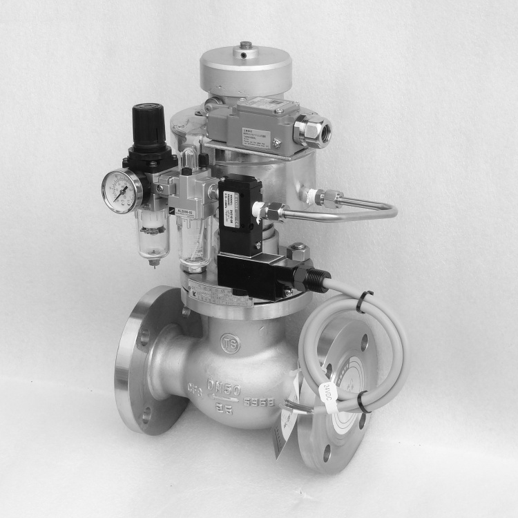 2、安全閥的升降彈簧復位結構設計,采用止回閥倒流壓力回位原理,氣動緊急切斷閥只能單向切斷,安裝時介質流向必須與閥體標識一致。