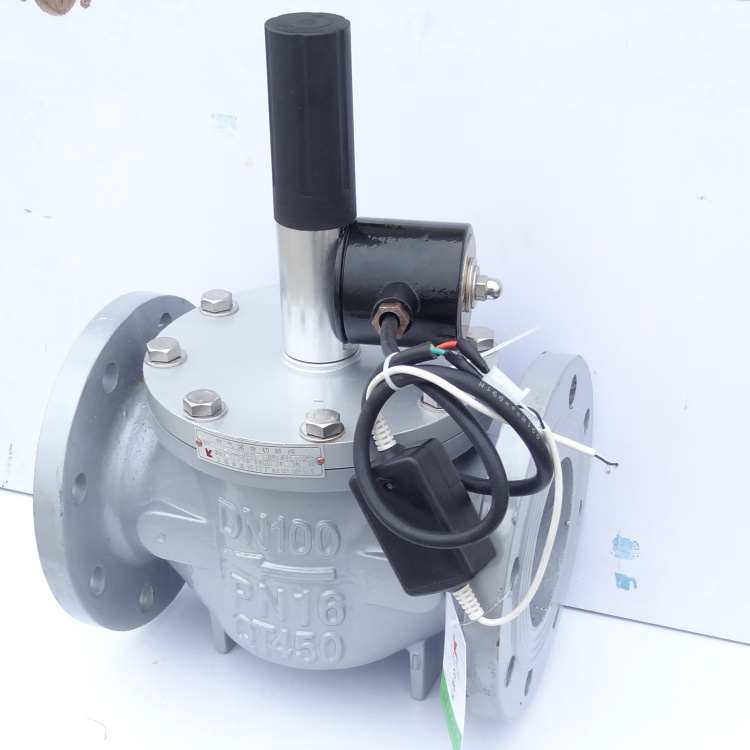 常閉式:燃氣安全切斷閥需要打開時,燃氣安全電磁閥先通電,旋下防護罩(防護罩中間有螺紋孔,將他旋在聯動桿上當手柄使用),用力拉手柄,燃氣切斷閥打開。燃氣電磁閥需要關閉時,線圈失電,燃氣切斷電磁閥迅速關閉。