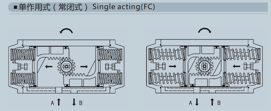 (順時(shí)針?lè)较颍┦饣蚴щ姇r(shí),由于彈簧的作用使兩活塞向中心移動(dòng),輸出軸順時(shí)針?lè)较蜣D(zhuǎn)動(dòng),關(guān)閉閥門(mén),空氣由A口排出。
