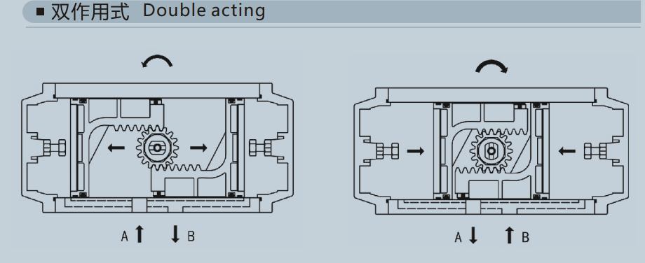(逆時(shí)針?lè)较颍嚎s空氣由A孔輸入,使左右活塞向相反方向運(yùn)動(dòng),輸出軸逆時(shí)針?lè)较蜣D(zhuǎn)動(dòng),打開(kāi)閥門(mén),兩活塞側(cè)面空氣由B口排出。
