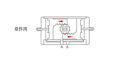(逆時(shí)針方向)壓縮空氣有A孔輸入,使左右活塞向相反方向運(yùn)動(dòng),輸出軸逆時(shí)針方向轉(zhuǎn)動(dòng),兩活塞側(cè)面空氣由B口排出。