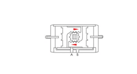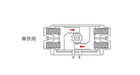 (順時(shí)針方向)壓縮空氣由B孔輸入,使左右活塞向中心移動(dòng),輸出軸順時(shí)針方向轉(zhuǎn)動(dòng),兩活塞中間的空氣由A口排出。