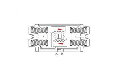 (順時(shí)針方向)失氣時(shí),由于彈簧的作用使兩活塞向中心移動(dòng),輸出軸順時(shí)針方向轉(zhuǎn)動(dòng),空氣由A口排出。