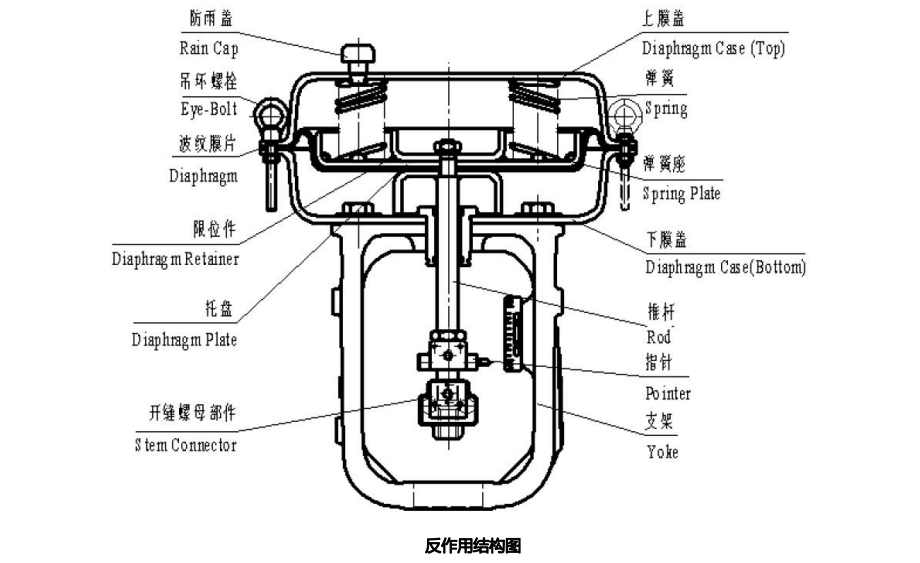 反作用:薄膜氣室供氣壓力增加,執行機構推桿向上運動