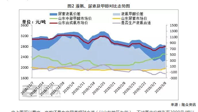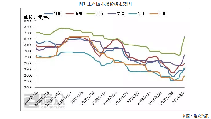 春節以后,氨市低谷運行,霧霾天氣的預警以及雨雪天氣的持續,對農需方面影響頗大,化肥企業出貨壓力較大,開工低位,庫存高位,導致采購積極性不高,氨市一度走弱,不過自2月底3月初以來,各生產企業調整生產結構,縮減商品氨量,據隆眾資訊統計,近一周時間縮減約12000噸的量,扭轉熊市局面,一周時間市場大步上揚,幅度80-330元/噸。