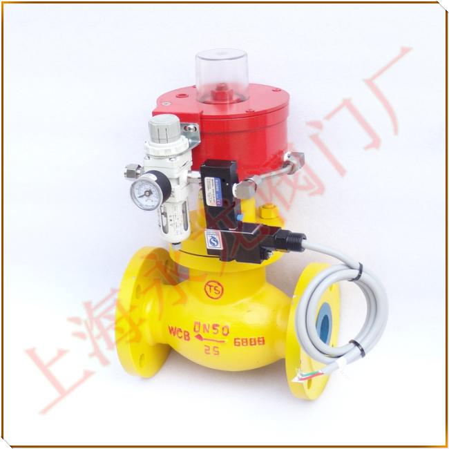 氣動站用切斷閥 Pneumatic standing with a shut-off valve屬于常閉式氣動截止閥 Pneumatic cut-off valve,采用直行程活塞式執行器,在執行機構裝置高溫熔斷裝置,當工況環境溫度超過易熔合金塞(75±5℃)設定的溫度,易熔合金塞熔解,氣源壓力從排氣孔排出降壓,切斷閥通過儲罐介質的壓力及彈簧的張力,快速截斷管道氣體/液體介質的流體,防止火災事故的發生。