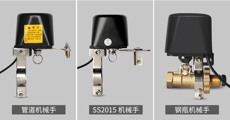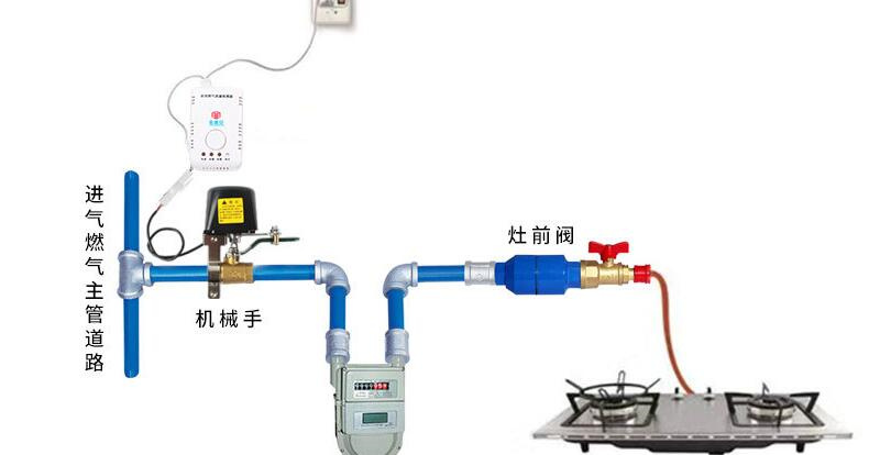 燃氣切斷閥控制機械手形式安裝在廚房燃氣表旁邊的手動球閥上面,與連接在可燃氣體報警器或家用燃氣報警器上連接控制,當可燃氣體探測器探測到氣體濃度超過警戒值時,可燃氣體報警器或家用燃氣報警器就會啟動燃氣門控制機械手,切斷氣源,防止出現泄漏造成不必要的損失。
