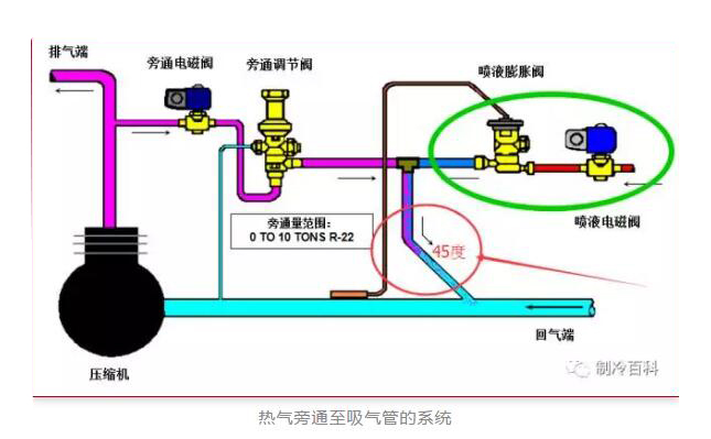(2)如果壓縮機位于蒸發器的上部,熱氣旁通至蒸發器時必須確保在低負荷旁通量的工況下 ,壓縮機有充足的回油量。