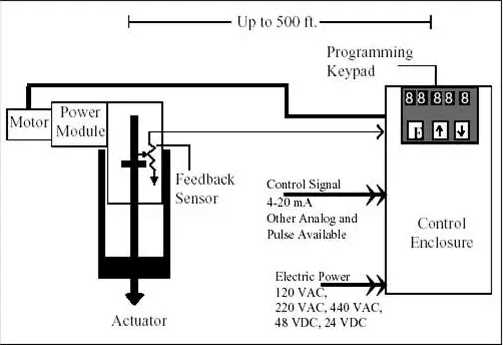 電液執行機構包含兩個主要部分,即執行器(缸和電液動力組件)部分和控制箱部分。執行機構裝在驅動裝置上,控制箱遠程安裝。連接它們的是模塊電纜和反饋電纜。控制箱包括位置控制處理器、電源供應、馬達驅動器、保險絲和電源濾波器以及接線端子。