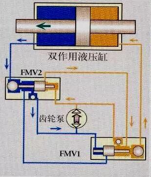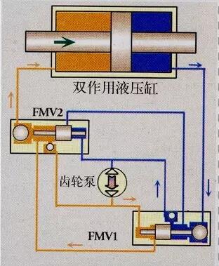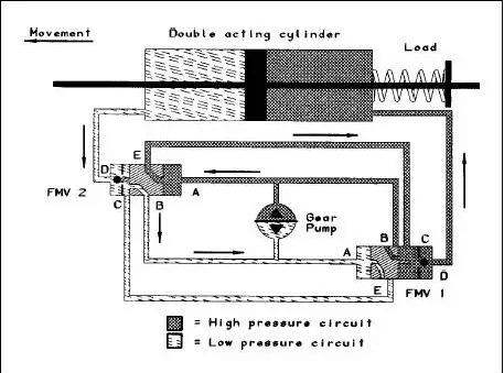 為把活塞移動到左邊,泵改變旋轉方向,通過A端口使FMV-2加壓,FMV-2的閥芯在壓差的作用下失去平衡移向左側,托起它的逆止閥,打開端口D到口B,端口A到E口。高壓流從端口E流到缸的右室,由于液壓回路是閉合的,與流入活塞右側數量相同的油必須從左側流出。這股油流通過FMV-2打開的逆止閥進入泵吸口。通過改變泵旋轉方向,FMV逆向操作,移動活塞桿到右側。